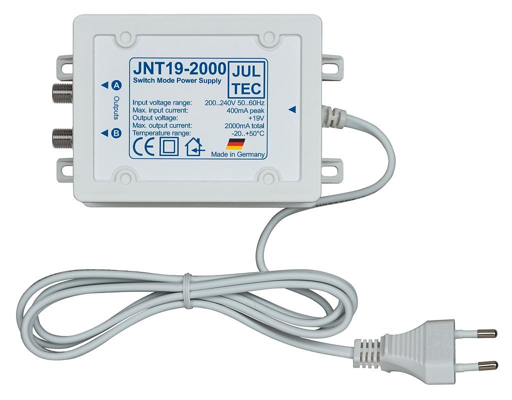 Beim Jultec JNT19-2000 handelt es sich um ein Schaltnetzteil zur Ergänzung von JULTEC-Verteilkomponenten. Das Netzteil JNT19-2000 ist dabei nicht nur mechanisch optimiert und für den Einsatz mit JULTEC-Komponenten maßgeschneidert, sondern auch besonders robust und langlebig ausgelegt. Darüber hinaus hält dieses Netzteil die strengen EMV- und Sicherheitsanforderungen der Antennenverteiltechnik ein. Das Netzteil ist mit zwei gleichberechtigten F-Buchsen ausgestattet, so dass auch mehrere Geräte aus einem Netzteil versorgt werden können (z.B. ein JPS und ein JMA). Die Ausgangsbuchsen des Netzteils haben die gleiche mechanische Anordnung wie die Verteilkomponenten, so dass das Netzteil mit dem hochwertigen Schnellverbinder JFQ1 direkt auf ein Gerät aufgeschoben werden kann. Die F-Anschlüsse sind beide HF-terminiert, d.h. mit dem Netzteil kann eine Stammleitung abgeschlossen werden (keine HF-Durchschleifung!). Dieses Schaltnetzteil wurde von einer spezialisierten Partnerfirma für JULTEC entwickelt und wird in Deutschland produziert.